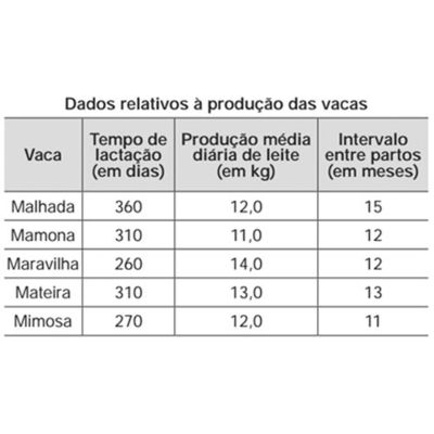 O índice de eficiência utilizado por um produtor de leite para qualificar suas vacas é dado pelo produto do tempo de lactação (em dias) pela produção média diária de leite (em \(kg\)), dividido pelo intervalo entre partos (em meses). Para esse produtor, a vaca é qualificada como eficiente quando esse índice é, no mínimo, \(281\) quilogramas por mês, mantendo sempre as mesmas condições de manejo (alimentação, vacinação e outros). Na comparação de duas ou mais vacas, a mais eficiente é a que tem maior índice.