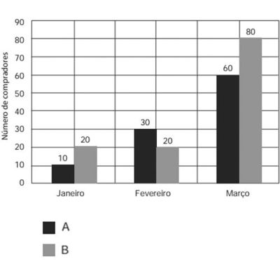 Uma loja acompanhou o número de compradores de dois produtos, \(A\) e \(B\), durante os meses de janeiro, fevereiro e março de 2012. Com isso, obteve este gráfico.