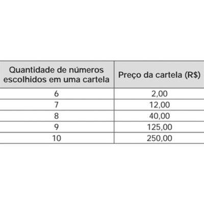 O quadro apresenta o preço de cada cartela, de acordo com a quantidade de números escolhidos.