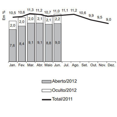 O gráfico apresenta a taxa de desemprego durante o ano de 2011 e o primeiro semestre de 2012 na região metropolitana de São Paulo. A taxa de desemprego total é a soma das taxas de desemprego aberto e oculto.