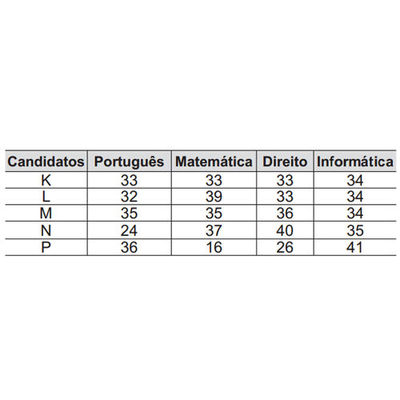 Os candidatos \(K\), \(L\), \(M\), \(N\) e \(P\) estão disputando uma única vaga de emprego em uma empresa e fizeram provas de português, matemática, direito e informática. A tabela apresenta as notas obtidas pelos cinco candidatos.