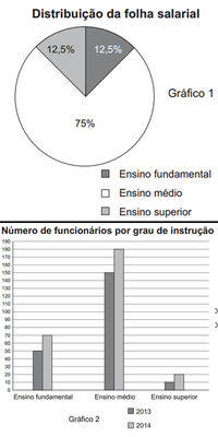 Uma empresa de alimentos oferece três valores diferentes de remuneração a seus funcionários, de acordo com o grau de instrução necessário para cada cargo. No ano de 2013, a empresa teve uma receita de \(10\) milhões de reais por mês e um gasto mensal com a folha salarial de \(R\$ 400\,000,00\), distribuídos de acordo com o Gráfico 1. No ano seguinte, a empresa ampliará o número de funcionários, mantendo o mesmo valor salarial para cada categoria. Os demais custos da empresa permanecerão constantes de 2013 para 2014. O número de funcionários em 2013 e 2014, por grau de instrução, está no Gráfico 2.