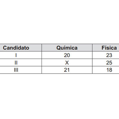 Ao final de uma competição de ciências em uma escola, restaram apenas três candidatos. De acordo com as regras, o vencedor será o candidato que obtiver a maior média ponderada entre as notas das provas finais nas disciplinas química e física, considerando, respectivamente, os pesos \(4\) e \(6\) para elas. As notas são sempre números inteiros. Por questões médicas, o candidato \(II\) ainda não fez a prova final de química. No dia em que sua avaliação for aplicada, as notas dos outros dois candidatos, em ambas as disciplinas, já terão sido divulgadas.