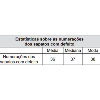 Uma loja que vende sapatos recebeu diversas reclamações de seus clientes relacionadas à venda de sapatos de cor branca ou preta. Os donos da loja anotaram as numerações dos sapatos com defeito e fizeram um estudo estatístico com o intuito de reclamar com o fabricante.