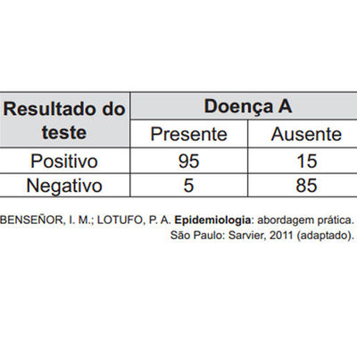 O quadro refere-se a um teste diagnóstico para a doença A, aplicado em uma amostra composta por duzentos indivíduos.