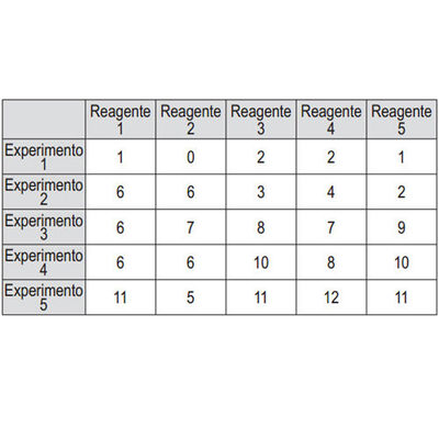 Um pesquisador está realizando várias séries de experimentos com alguns reagentes para verificar qual o mais adequado para a produção de um determinado produto. Cada série consiste em avaliar um dado reagente em cinco experimentos diferentes. O pesquisador está especialmente interessado naquele reagente que apresentar a maior quantidade dos resultados de seus experimentos acima da média encontrada para aquele reagente. Após a realização de cinco séries de experimentos, o pesquisador encontrou os seguintes resultados.