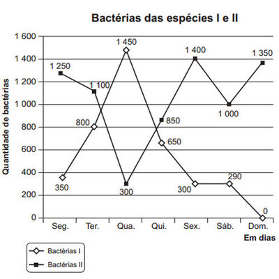Um cientista trabalha com as espécies I e II de bactérias em um ambiente de cultura. Inicialmente, existem \(350\) bactérias da espécie I e \(1\, 250\) bactérias da espécie II. O gráfico representa as quantidades de bactérias de cada espécie, em função do dia, durante uma semana.