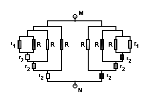 Os valores das resistências do circuito representado a seguir são: R=8Ù, r1=2Ù e r2=0,4Ù. A resistência equivalente, entre os pontos M e N, vale: