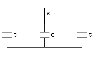No circuito a seguir, há três capacitores idênticos. O capacitor central está carregado e a energia eletrostática nele armazenada vale U0. Os outros dois capacitores estão inicialmente descarregados. A chave S é então acionada, ligando o capacitor central a um dos capacitores laterais, por alguns instantes. Em seguida essa operação é repetida com o outro capacitor lateral. A energia total final armazenada nos três capacitores vale: