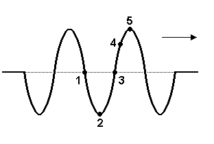 A figura a seguir representa uma onda harmônica que se propaga, para a direita, em uma corda homogênea. No instante representado, considere os pontos da corda indicados: 1, 2, 3, 4 e 5. Assinale a afirmativa correta.