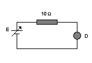 No circuito a seguir, D é um dispositivo cujo comportamento depende da diferença de potencial aplicada sobre ele: comporta-se como um resistor normal de resistência igual a 5Ù, enquanto a diferença de potencial entre seus extremos for inferior a 3,0 volts e, impede que essa diferença de potencial ultrapasse 3,0 volts, mesmo que a f.e.m., E, da bateria (ideal) aumente. A f.e.m., E, está aumentando continuamente. Quando E atingir 12 volts, o valor da corrente no circuito será, em amperes: