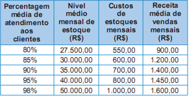A Cia. Distribuidora de Peças Ltda. distribui peças para oficinas de reparo de automóveis localizadas em grande área metropolitana. Embora se trate de um mercado competitivo, a Cia. Alonso gostaria de oferecer níveis de estoque adequados às oficinas atendidas, ao mesmo tempo em que deseja maximizar seus lucros. Ela é sabedora de que, à medida que aumenta a percentagem média de atendimentos aos clientes (nível de serviço), maior é seu custo de estoques. A fim de determinar a influência dos níveis de estoque no percentual de atendimento aos clientes, a Cia. fez um levantamento dos principais itens de seu estoque nos últimos seis meses. A partir dos dados apresentados nessa tabela, pode-se concluir que o maior lucro ocorrerá quando o nível de serviço for equivalente a: