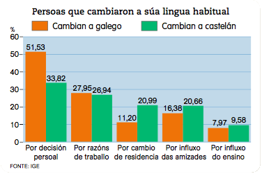 O factor que máis cambios de idioma provoca é [blank_start]a decisión persoal[blank_end]; esta favorece [blank_start]o galego[blank_end] porque hai sectores da poboación que se conciencian. O que máis favorece o paso ao castelán é [blank_start]o cambio de residencia[blank_end], porque hai máis traslados para as urbes. O ámbito do ensino ten un influxo [blank_start]menor[blank_end] no cambio de lingua (non chega ao [blank_start]10[blank_end]%) e, en todo caso, favorece a [blank_start]castelanización[blank_end].