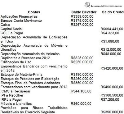 Uma sociedade empresária apresentou, em 31.12.2011, os seguintes saldos de contas, conforme figura 1.