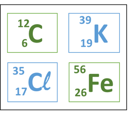 Então olhe com a atenção as representações dos átomos dos elementos químicos carbono, potássio, cloro e ferro que aparecem logo a seguir. Para cada um deles, descubra o número atômico (Z).