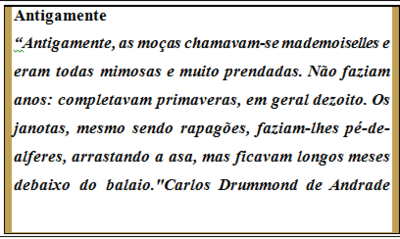 Na expressão “Porém meus olhos não perguntam nada./ O homem atrás do bigode é sério, simples e forte./Quase não conversa./Tem poucos, raros amigos/o homem atrás dos óculos e do bigode.” (Poema de sete faces, Carlos Drummond de Andrade), temos:
