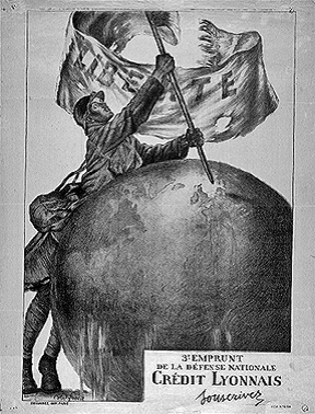 Em 1º plano, globo terrestre com mancha de sangue alastrando a partir da França; por detrás, soldado francês tentando, com dificuldade, fixar nesse ponto uma bandeira um pouco esfarrapada com a palavra “Liberté” (“Liberdade”). O soldado veste uma farda de cor azul; a bandeira é branca, com letras vermelhas, mesma cor do sangue que escorre sobre o globo. Vermelho, azul e branco são as cores da bandeira francesa. Pela análise do texto e da imagem, conclui-se que uma ideologia está por trás, tanto da discussão realizada no excerto, quanto na montagem e na organização do cartaz. Essa mesma ideologia esteve não somente entre as causas da Grande Guerra, mas também nas insatisfações que levariam à Segunda Guerra Mundial (1939–1945). Trata-se do