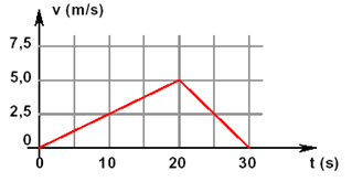 O gráfico ao lado representa o movimento retilíneo de um objeto que parte do repouso em t = 0. Ele é acelerado durante 20 s até atingir a velocidade de 5,0 m/s e a seguir sofre uma desaceleração que atua durante 10 s, fazendo-o parar. Qual o espaço total percorrido pelo objeto?