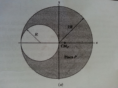 A figura ao lado mostra uma placa de metal uniforme P de raio 2R, da qual um disco de raio R foi removido em uma linha de montagem. Usando o sistema de coordenadas xy da figura, localize o centro de massa da Placa.