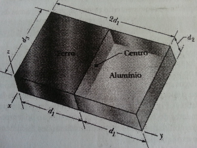 A figura ao lado mostra uma placa composta de dimensões d1= 11,0cm, d2 = 2,8cm e d3 = 13,0cm. Metade da placa é feita de alumínio(massa específica = 2,70 g/cm³) e a outra metade de ferro(massa específica = 7,85 g/cm³). Determine a coordenada X, Y e Z do centro da massa do objeto.