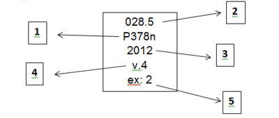1) CUTTER ; (2) CDD ; (3) ANO DE PUBLICAÇÃO ; (4) NÚMERO DE EXEMPLAR ; (5) VOLUME DA OBRA