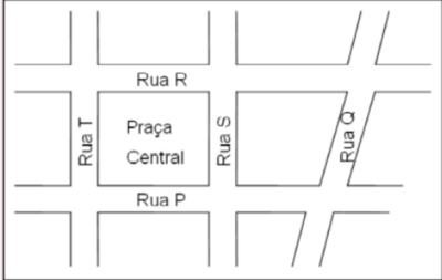 A figura abaixo representa um trecho do mapa de um bairro. Se a praça central tem a forma de um retângulo, então a rua T é paralela à rua