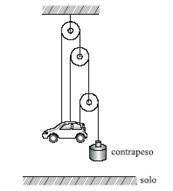 Considerando as polias e os cabos como ideais e, ainda, os cabos convenientemente presos ao carro para que não haja movimento de rotação, determine a massa mínima do contrapeso e o valor da força que o cabo central exerce sobre o carro, com massa de 700 kg, quando esse se encontra suspenso e em equilíbrio estático.