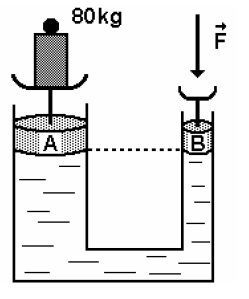 (Mackenzie 98) Dispõe-se de uma prensa hidráulica conforme o esquema a seguir, na qual os êmbolos A e B, de pesos desprezíveis, têm diâmetros respectivamente iguais a 40cm e 10cm. Se desejarmos equilibrar um corpo de 80kg que repousa sobre o êmbolo A, deveremos aplicar em B a força perpendicular F, de intensidade: Dado: g = 10 m/s²