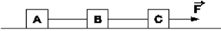 Três blocos, A, B e C, deslizam sobre uma superfície horizontal cujo atrito com estes corpos é desprezível, puxados por uma força F de intensidade 6,0N.