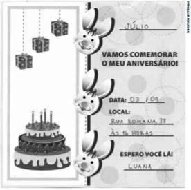 CLIQUE NO QUADRADINHO QUE MOSTRA UMA INFORMAÇÃO QUE NÃO APARECE EM UM CONVITE DE ANIVERSÁRIO.