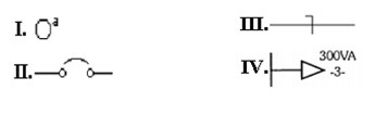 I-Interruptor de uma seção; II- Disjuntor a seco; III- Condutor de neutro; IV- Tomada de corrente na parede, baixa.