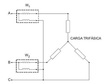 Utilizando-se a configuração ao lado para a ligação de dois wattímetros, é possível realizar a medição das potências ativa e reativa em uma carga trifásica. Sabendo-se que as medições dos wattímetros são W1 e W2, a soma de W1 e W2 é igual à potência: