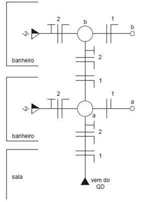 Ao fazer o diagrama unifilar dos circuitos 1: iluminação dos banheiros e 2: tomadas dos banheiros, foi cometido um erro no eletroduto que liga: