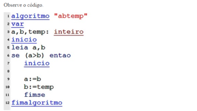 O conteúdo adequado para a linha oito, que permite a troca de valores entre as variáveis "a" e "b" ao final do programa, caso a variável "a" seja maior que a variável "b", é