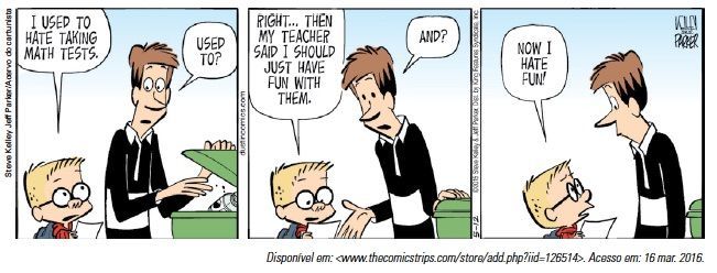 Instrumentos de avaliação da aprendizagem fazem parte do processo educacional e os alunos reagem de formas diferentes a esses instrumentos. Na tirinha apresentada, o menino