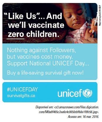 A Unicef é uma agência das Nações Unidas que tem como objetivo a promoção da defesa dos direitos das crianças. Em todo o mundo, ela é responsável por ajudar milhões de crianças. O cartaz da Unicef ao lado destaca a importância de os usuários da Internet