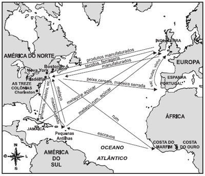 Observe o mapa, em que estão representados os intercâmbios comerciais das Colônias Inglesas da América do Norte: Considerando-se as informações desse mapa e outros conhecimentos sobre o assunto, é CORRETO afirmar que :
