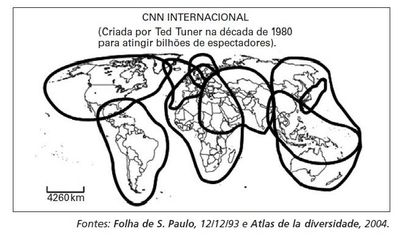 O mapa acima representa as áreas de cobertura dos satélites utilizados pela CNN, uma das principais redes mundiais de comunicação. Com auxílio do mapa, é possível afirmar que as grandes redes de comunicação: