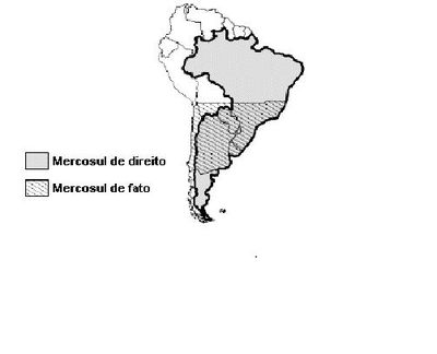 Analise este mapa, em que estão destacadas as áreas de abrangência do Mercosul, tanto a legal - denominada "Mercosul de direito" - quanto aquela em que se estabeleceram mais intensamente as relações propostas para o estágio em que se encontra esse bloco econômico - denominada "Mercosul de fato": O Mercosul de fato e o de direito Considerando-se a área do Mercosul de fato, é INCORRETO afirmar que ela