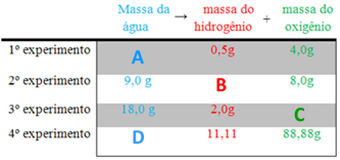 Com base nessas leis, indique a alternativa que traz os respectivos valores das massas (em gramas) que substituiriam corretamente as letras A, B, C e D nesses experimentos: