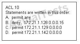 Statements A, B, C, and D of ACL 10 have been entered in the shown order and applied to interface E0 inbound, to prevent all hosts (except those whose addresses are the first and last IP of subnet 172.21.1.128/28) from accessing the network. But as is, the ACL does not restrict anyone from the network. How can the ACL statements be re-arranged so that the system works as intended?