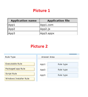 Your network contains an Active Directory domain named contoso.com. All servers run Windows Server 2012 R2.All client computers run Windows 8. The domain contains a security group named Group1. You have a Group Policy object (GPO) named GPO1.GPO1 is linked to the domain. You need to ensure that only the members of Group1 can run the applications shown in the following table. (see picture1) Which type of application control policy should you implement for each application? To answer, select the appropriate rule types to the correct applications. Each rule type may be used once, more than once, or not at all. You may need to drag the split bar between panes or scroll to view content.