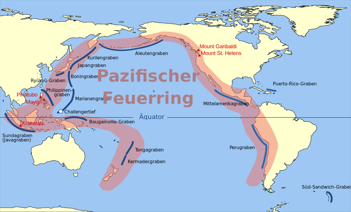 Der Pazifische Feuerring ist ein Vulkangürtel, der den Pazifischen Ozean von drei Seiten umgibt. Mindestens zwei Drittel aller im Holozän ausgebrochenen Vulkane sind dort zu finden. Auch starke Erdbeben treten entlang dieses Ringes gehäuft auf. Diese lösen bisweilen die für den Pazifik typischen Tsunamis aus.