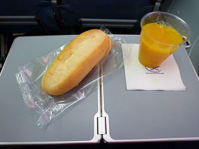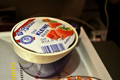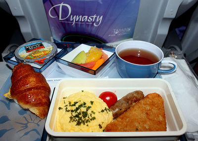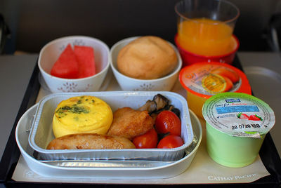 Eier, Würstchen, Früchte und Joghurt. Welche Fluggesellschaft servierte dieses nahrhafte Frühstück?