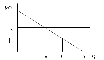 In the diagram at right, the net-of-tax supply curve is at $5, and the gross-of-tax supply curve is at $8. The demand curve is the downward-sloping line with a horizontal intercept of 15. What is the deadweight loss of the tax?