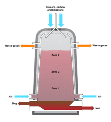 Iron ore, limestone and [blank_start]coke[blank_end] are fed into the top of the furnace. Then [blank_start]hot air[blank_end] is blasted through the furnace. [blank_start]Oxygen[blank_end] in the hot air reacts with [blank_start]carbon[blank_end] to form [blank_start]carbon dioxide[blank_end] and then the carbon dioxide reacts with the coke to form [blank_start]carbon monoxide[blank_end]. This gas reacts with [blank_start]iron oxide[blank_end] changing it to [blank_start]iron[blank_end]. In the end the [blank_start]limestone[blank_end] reacts with the [blank_start]impurities[blank_end] to form [blank_start]slag[blank_end] which runs to the bottom of the furnace where it [blank_start]floats on top of[blank_end] the molten iron. During this process the [blank_start]molten iron[blank_end] runs to the bottom of the furnace where it is [blank_start]tapped off[blank_end].