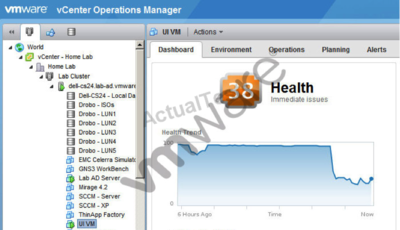 The vCenter Operations Manager dashboard is showing Health issues associated with the selected virtual machine. There have been no availability or configuration issues with the virtual machine, and the workload badge is still green: