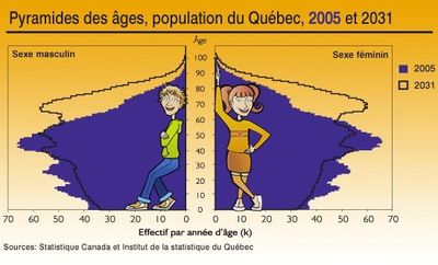 Constat: De nos jours au Québec, la population est de plus en plus vieillisante (le groupe de population prédominant est de 45 à 55 ans) alors qu'en 1971 le groupe de population prédominant était de 0 à 15 ans.