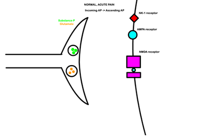 Binding of Substance P and Glutamate activate the AMPA and NK-1 receptors respectively. This causes sufficient depolarisation in order to repel the magnesium dependent block out of the VG Ca2+ channel. Calcium entry causes 2ndry messenger activation and increased neurone responsiveness. This increases the rate of AP firing and explains why pain is more intense in secondary hyperalgesia.
