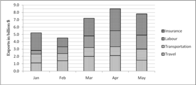 The bar graph depicts the monthly exports of services in four different sectors from Jan to May. All figures are in billion $. Read the graph carefully and then answer the questions that follow. (this set contains 4 questions )